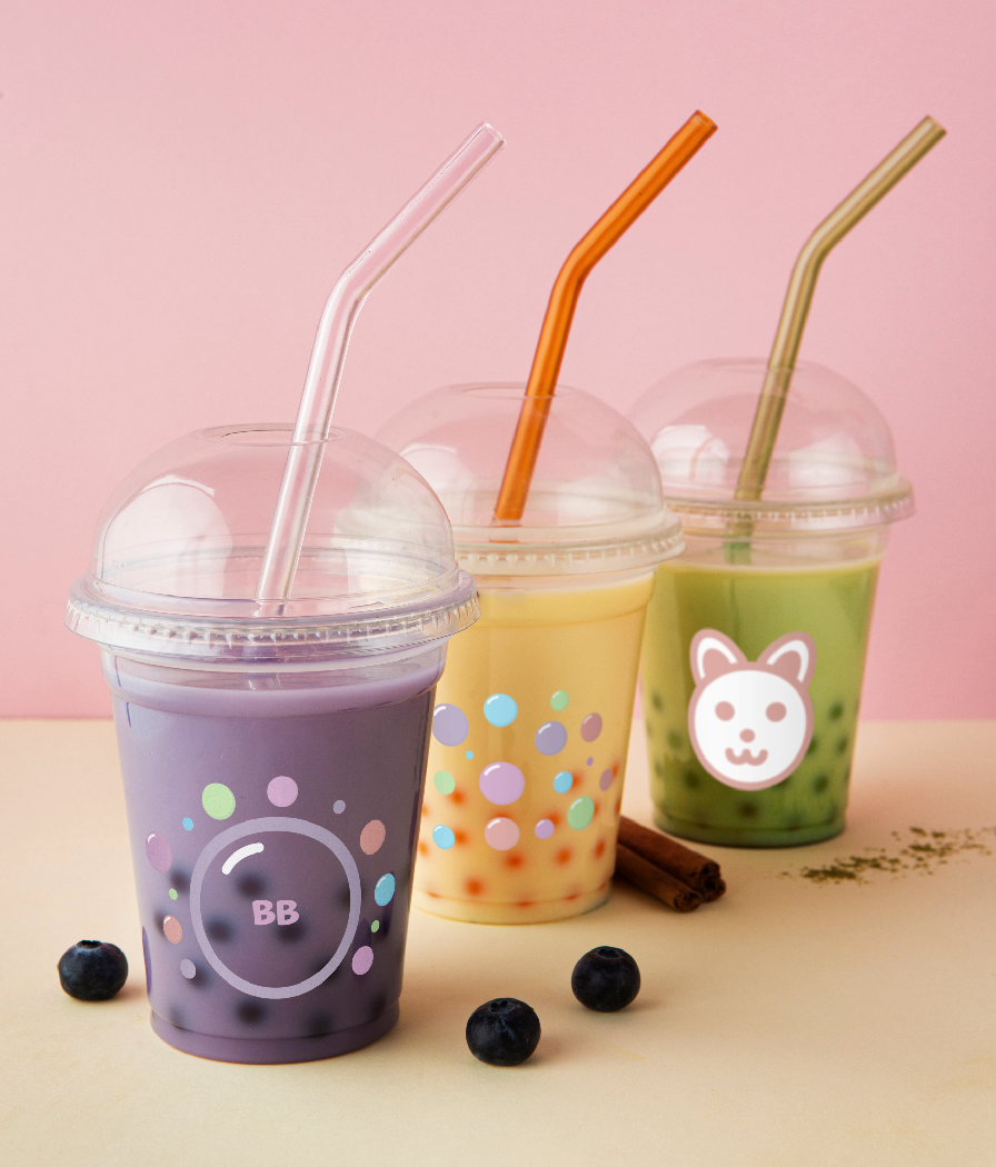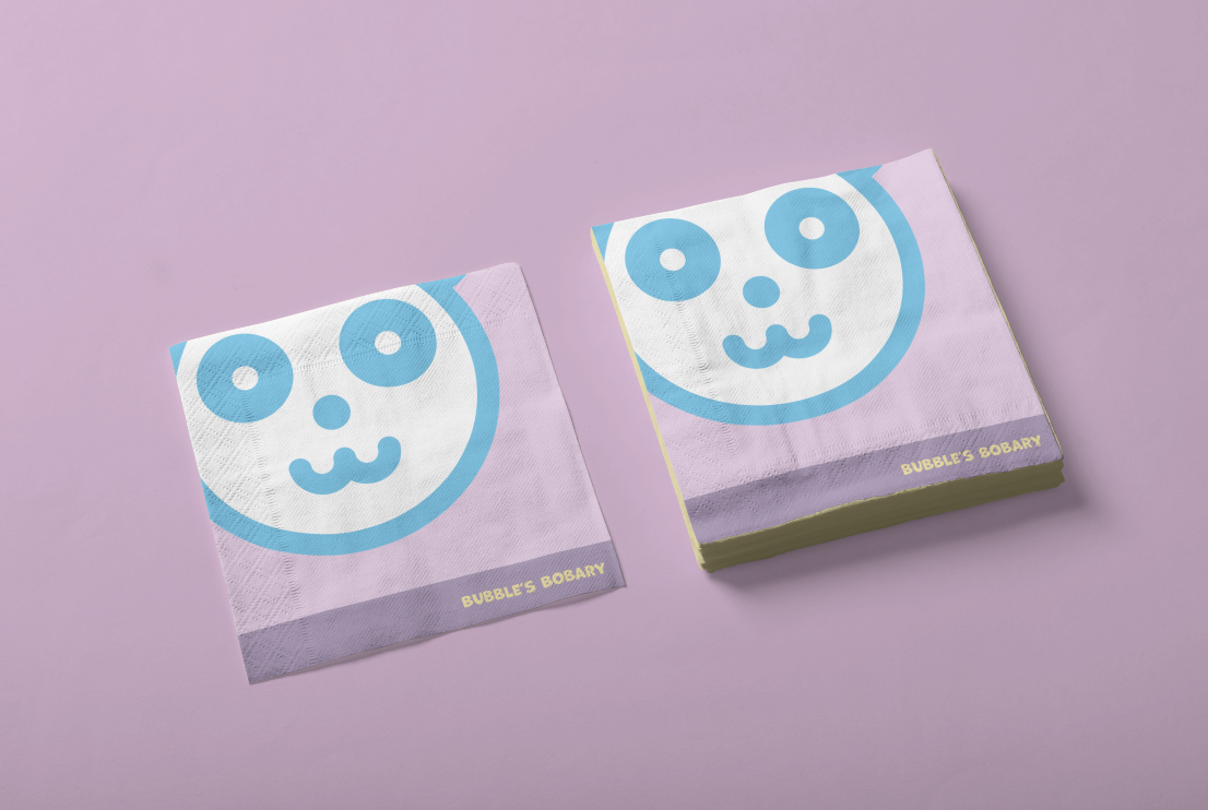 The logo has a bubble with the name and founding date around it. The logo keeps the fun aspect but also stays elevated. Throughout the different deliverables, I wanted to space out the patterns and logos. Everything is rounded in shape to represent boba.