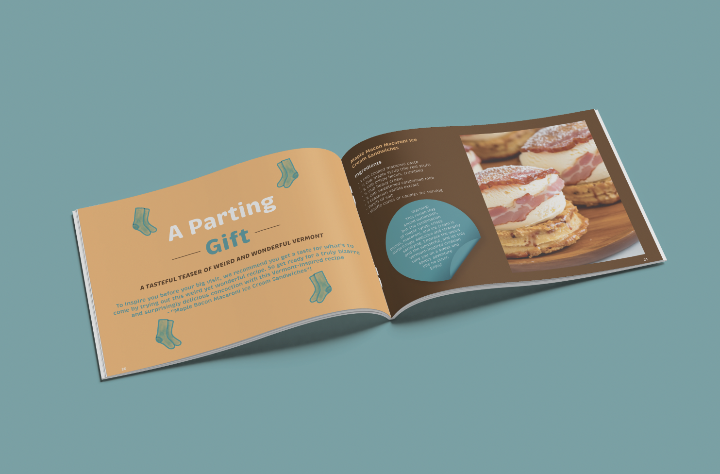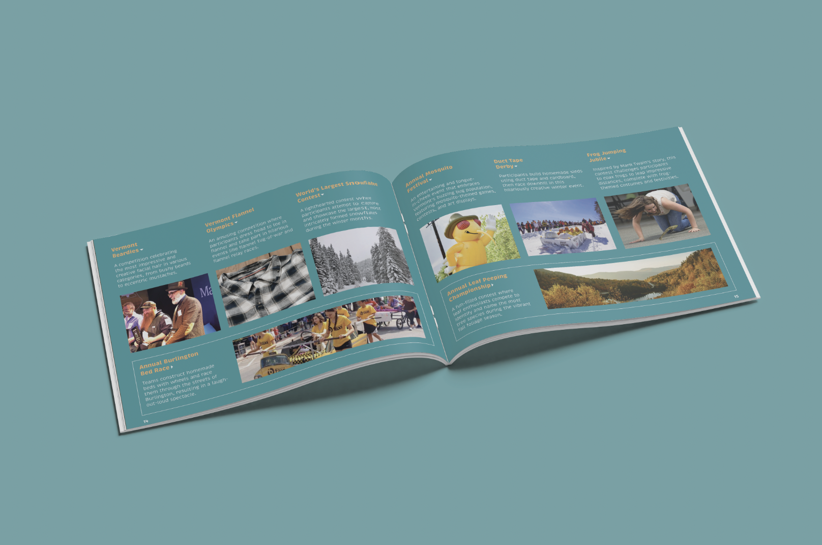 We were tasked to create a travel guide for Vermont. The problem was to fit the text given to us into spreads. Each section has a title and subtext that showcase the quirkiness of Vermont.